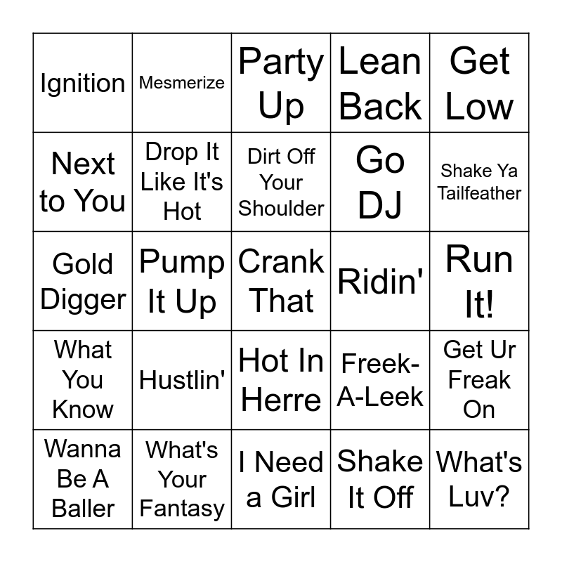 This bingo card has 41 words: In Da Club, Gold Digger, Ms. Jackson, Drop It Like It's Hot, What's Your Fantasy, Hot In Herre, Dirt Off Your Shoulder, The Real Slim Shady, Get Low, What You Know, Pump It Up, Lean Back, Crank That, Run It!, Ridin', Hustlin', The Way I Are, Ignition, Let Me Love You, Party Up, Get Ur Freak On, What's Luv?, I Need a Girl, Go DJ, Suga Suga, Blow the Whistle, Shake It Off, Where the Party At, Shake Ya Tailfeather, Lean Wit It, Rock Wit It, Buy U a Drank, Mesmerize, Wanna Be A Baller, Burn, Freek-A-Leek, Next to You, Overnight Celebrity, It's Goin' Down, I'm a Thug, Chain Hang Low and Kick, Push.