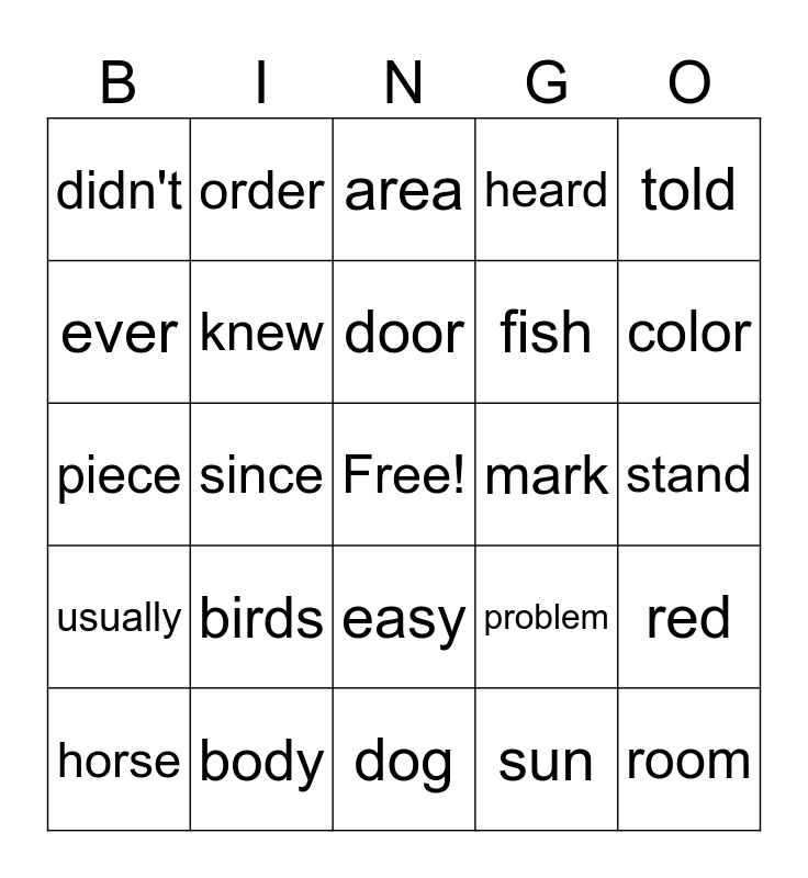 This bingo card has a free space and 29 words: horse, question, since, friends, didn't, area, knew, birds, mark, body, stand, room, dog, sun, color, complete, easy, usually, told, piece, problem, music, fish, ever, heard, order, red, door and sure.