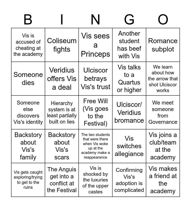 This bingo card has a free space and 24 words: Backstory about Vis's scars, The Anguis get into a conflict at the Festival, Ulciscor betrays Vis's trust, Vis gets caught exploring/trying to get to the ruins, Romance subplot, Vis is accused of cheating at the academy, Someone dies, Coliseum fights, Ulciscor/ Veridius bromance, The two students that were there when Vis woke up at the academy make a reappearance, Vis talks to a Quartus or higher, Someone else discovers Vis's identity, Vis switches allegiance, Vis joins a club/team at the academy, Veridius offers Vis a deal, Confirming Vis's adoption is complicated, We meet someone from Governance, Vis sees a Princeps, We learn about how the arrow that shot Ulciscor works, Hierarchy system is at least partially built on lies, Vis makes a friend at the academy, Backstory about Vis's family, Another student has beef with Vis and Vis is shocked by the luxuries of the upper castes.