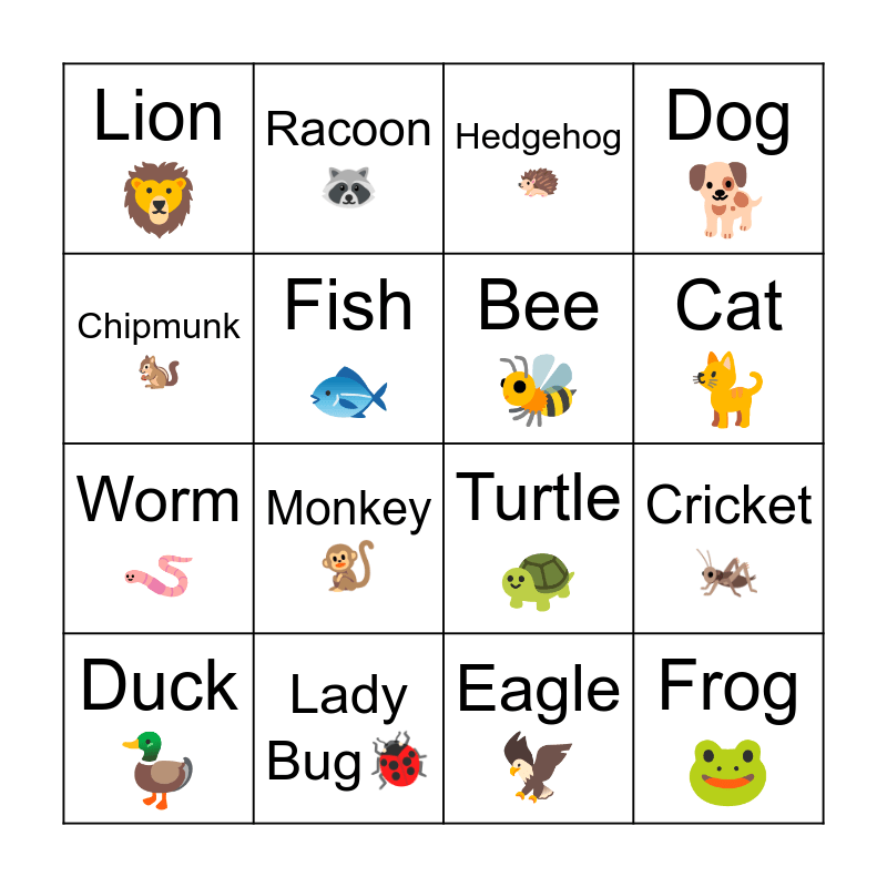 This bingo card has 37 words: Bat🦇, Bear🐻, Beaver🦫, Bee🐝, Bird🐦, Butterfly🦋, Cat🐈, Chicken🐔, Chipmunk🐿️, Cow 🐄, Cricket 🦗, Dog🐕, Duck 🦆, Eagle 🦅, Fish 🐟, Frog 🐸, Giraffe 🦒, Hedgehog 🦔, Horse🐎, Lady Bug🐞, Lion 🦁, Monkey🐒, Mouse 🐀, Owl🦉, Pig🐖, Rabbit 🐇, Racoon 🦝, Shark 🦈, Skunk 🦨, Snake 🐍, Spider 🕷️, Tiger 🐯, Turtle 🐢, Whale 🐳, Wolf 🐺, Worm🪱 and Zebra🦓.