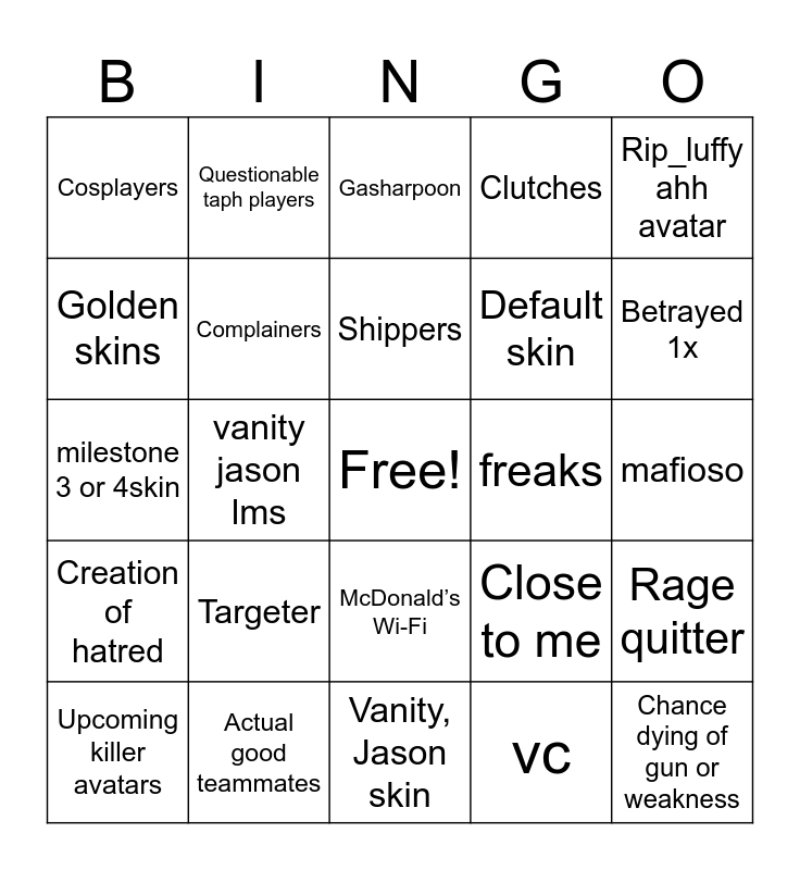 This bingo card has a free space and 24 words: Targeter, Actual good teammates, Shippers, Upcoming killer avatars, Rip_luffy ahh avatar, Cosplayers, Golden skins, Questionable taph players, freaks, McDonald’s Wi-Fi, Default skin, milestone 3 or 4skin, Close to me, Rage quitter, Complainers, vc, mafioso, Gasharpoon, Betrayed 1x, vanity jason lms, Chance dying of gun or weakness, Creation of hatred, Clutches and Vanity, Jason skin.