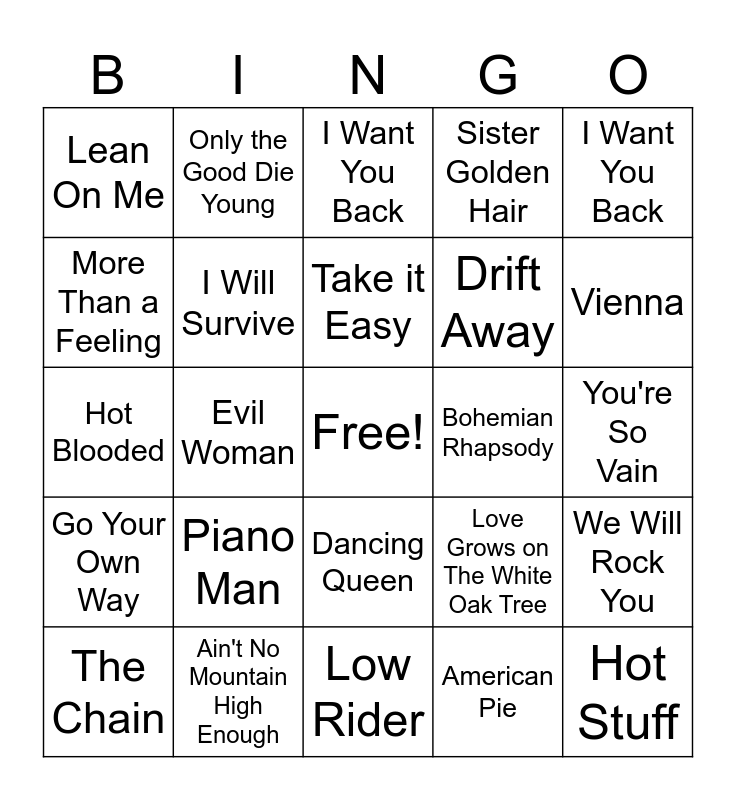 This bingo card has a free space and 39 words: Stayin' Alive, Let's Stay Together, Bennie and the Jets, I Will Survive, The Chain, Dancing Queen, Take it Easy, Come and Get Your Love, I Want You Back, Go Your Own Way, Evil Woman, Sister Golden Hair, Hot Stuff, You're So Vain, Bohemian Rhapsody, Piano Man, Have You Seen the Rain?, Lean On Me, Mr. Blue Sky, Love Grows on The White Oak Tree, More Than a Feeling, Low Rider, Drift Away, Vienna, September, Rich Girl, Carry On Wayward Son, Lovely Day, I Want You to Want Me, Only the Good Die Young, Play That Funky Music, Your Song, I Want You Back, Ain't No Mountain High Enough, American Pie, Lean on Me, We Will Rock You, Hot Blooded and Beast of Burden.