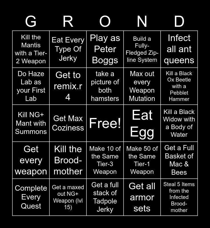 This bingo card has a free space and 34 words: Get at least a 95% Report Card, Get all armor sets, Kill the Infected Brood-mother Without A Pet or Offhand, Make your base in the sandbox, Get every weapon, Get to remix.r 4, Infect all ant queens, Complete Every Quest, Eat Every Type Of Jerky, Discover Every Field Station, take a picture of both hamsters, Play as Peter Boggs, Cook one of every meal, Make a full basket of bandages, Eat Egg, Kill a Black Ox Beetle with a Pebblet Hammer, Get a maxed out NG+ Weapon (lvl 15), Kill NG+ Mant with Summons, Kill the Brood-mother, Make 50 of the Same Tier-1 Weapon, Make 10 of the Same Tier-3 Weapon, Get 2 Science Waffles with the Same Modifiers, Kill the Mantis with a Tier-2 Weapon, Kill a Black Widow with a Body of Water, Get a full stack of Tadpole Jerky, Steal 5 Items from the Infected Brood-mother, Build a Fully-Fledged Zip-line System, Kill a Ladybug in your first 15 Minutes, Max out every Weapon Mutation, Do Haze Lab as your First Lab, Build a Base on the Main-House Porch, Get Max Coziness, Get a Full Basket of Mac & Bees and Eat 10 Perfect Toast.