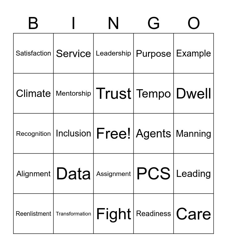 This bingo card has a free space and 77 words: Morale, Culture, Leadership, Resilience, Esprit, Mindset, Values, Leadership, Opendoor, Balance, Wellness, Cohesion, Trust, Climate, Development, Inclusion, Mission, Care, Empowerment, Example, Accountability, Recognition, Mentorship, Service, Purpose, Ownership, Listening, Talent, Retention, Progression, NCOs, Feedback, Incentives, PCS, Dwell, Tempo, Overload, Deployment, Manning, Readiness, Synchronization, Policy, Promotion, Structure, Sustainment, Recruiting, Reenlistment, Satisfaction, Broadening, Burnout, Initiatives, Assignment, BLUF, Fruit, Shift, Messaging, Buy-in, Unity, Integration, Metrics, Data, Lessons, Improvement, AAR, Practices, Engagement, Gaps, Agents, Topdown, Change, Teams, Leading, Alignment, Transformation, Verticality, Fight and Reinvigoration.