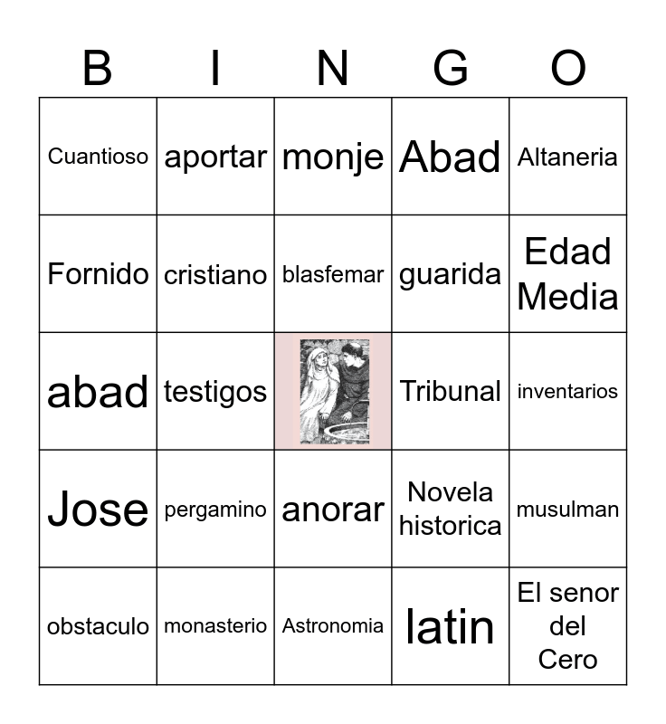 This bingo card has a free space and 24 words: pergamino, monasterio, blasfemar, obstaculo, Altaneria, Cuantioso, Fornido, aportar, Tribunal, anorar, guarida, abad, Novela historica, musulman, cristiano, latin, inventarios, monje, Edad Media, testigos, El senor del Cero, Jose, Abad and Astronomia.