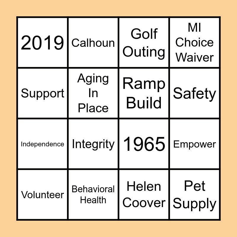 This bingo card has 40 words: Home Delivered Meals, 1965, Congregate Dining, Ramp Build, Thrive, Home Repair, Safety, Companion, Support, Pet Supply, Empower, MI Choice Waiver, Volunteer, Helen Coover, Behavioral Health, Serve, 2021, 2019, Dance Party, Golf Outing, Donate, Nutrition, Independence, Aging In Place, Community, Healthy, Assessment, Caring, Positive, Inclusive, Accessible, Collaboration, Dedication, Resourcefulness, Integrity, Partnership, Kalamazoo, Connect, Calhoun and Options.