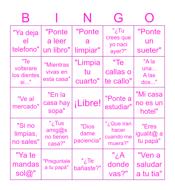 This bingo card has a free space and 24 words: "¿Tus amig@s no tienen casa?", "Preguntale a tu papá", "Limpia tu cuarto", "Ya te mandas sol@", "Ponte un sueter", "Ya deja el telefono", "Te volterare los dientes si...", "Ponte a leer un libro", "Ponte a estudiar", "Dios dame paciencia", "Te callas o te callo", "Ve al mercado", "¿Que iran hacer cuando me muera?", "Eres igualit@ a tu papá", "Mientras vivas en esta casa", "¿A donde vas?", "Mi casa no es un hotel", "Ponte a limpiar", "A la una... A las dos...", "En la casa hay sopa", "Ven a saludar a tu tia", "Si no limpias, no sales", "¿Tu crees que yo naci ayer?" and "¿Te bañaste?".