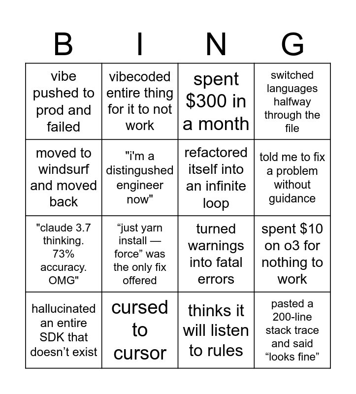 This bingo card has 16 words: cursed to cursor, spent $10 on o3 for nothing to work, spent $300 in a month, vibe pushed to prod and failed, "claude 3.7 thinking. 73% accuracy. OMG", vibecoded entire thing for it to not work, turned warnings into fatal errors, thinks it will listen to rules, moved to windsurf and moved back, "i'm a distingushed engineer now", hallucinated an entire SDK that doesn’t exist, switched languages halfway through the file, “just yarn install —force” was the only fix offered, told me to fix a problem without guidance, refactored itself into an infinite loop and pasted a 200-line stack trace and said “looks fine”.