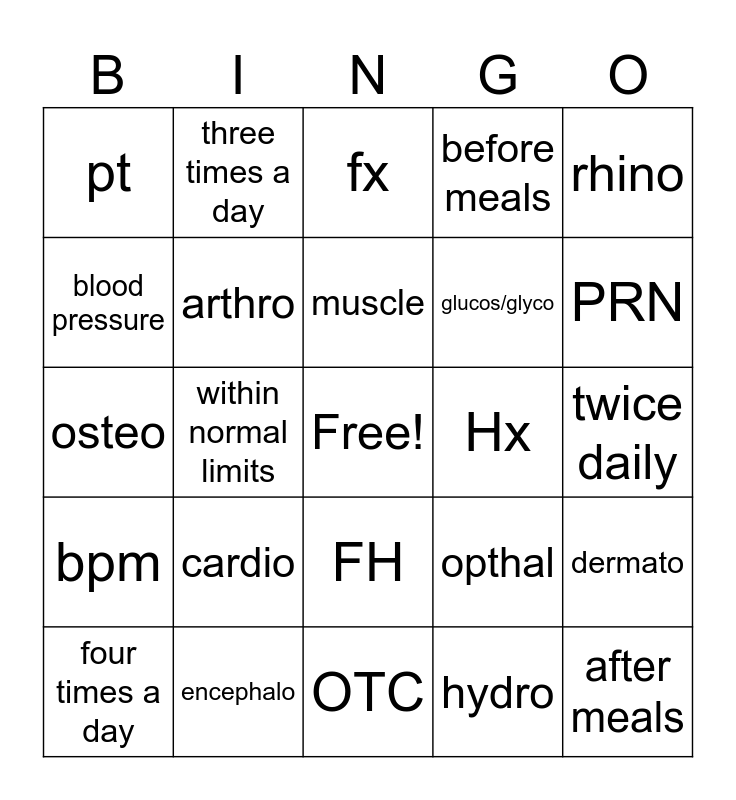 This bingo card has a free space and 37 words: -pnea, fear of, -uria, arthro, dermato, cardio, muscle, stomach, rhino, NKDA, within normal limits, before meals, after meals, twice daily, blood pressure, bpm, CPR, fx, FH, Hx, pt, PRN, four times a day, OTC, hyper, hydro, three times a day, -itis, cyte, bio, thoraco, encephalo, osteo, hepato, opthal, glucos/glyco and against medical advice.