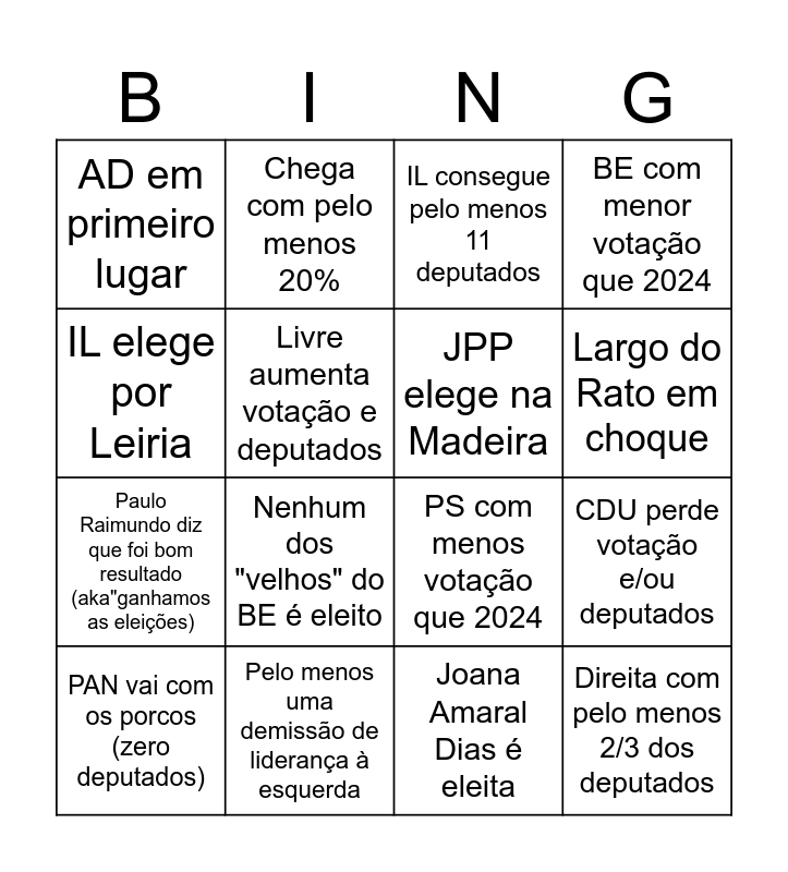 This bingo card has 16 words: PAN vai com os porcos (zero deputados), Pelo menos uma demissão de liderança à esquerda, IL consegue pelo menos 11 deputados, BE com menor votação que 2024, IL elege por Leiria, Chega com pelo menos 20%, PS com menos votação que 2024, CDU perde votação e/ou deputados, AD em primeiro lugar, Livre aumenta votação e deputados, Joana Amaral Dias é eleita, Largo do Rato em choque, Paulo Raimundo diz que foi bom resultado (aka"ganhamos as eleições), Nenhum dos "velhos" do BE é eleito, JPP elege na Madeira and Direita com pelo menos 2/3 dos deputados.