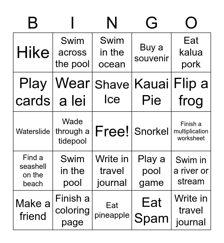 This bingo card has a free space and 24 words: Swim in the pool, Finish a coloring page, Shave Ice, Make a friend, Eat kalua pork, Hike, Play cards, Swim across the pool, Snorkel, Write in travel journal, Kauai Pie, Waterslide, Play a pool game, Swim in a river or stream, Wear a lei, Eat Spam, Finish a multiplication worksheet, Swim in the ocean, Flip a frog, Wade through a tidepool, Write in travel journal, Find a seashell on the beach, Buy a souvenir and Eat pineapple.