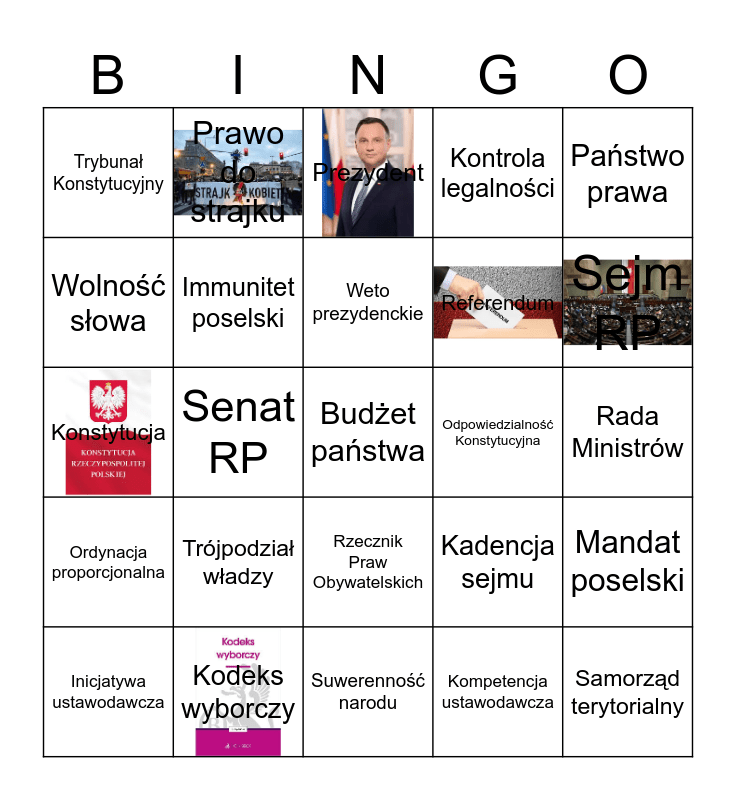 This bingo card has 6 images and 25 words: Trójpodział władzy, Suwerenność narodu, Weto prezydenckie, Inicjatywa ustawodawcza, Państwo prawa, Trybunał Konstytucyjny, Wolność słowa, Prawo do strajku, Odpowiedzialność Konstytucyjna, Rzecznik Praw Obywatelskich, Referendum, Konstytucja, Kadencja sejmu, Mandat poselski, Immunitet poselski, Samorząd terytorialny, Rada Ministrów, Prezydent, Sejm RP, Senat RP, Budżet państwa, Kodeks wyborczy, Ordynacja proporcjonalna, Kontrola legalności and Kompetencja ustawodawcza.