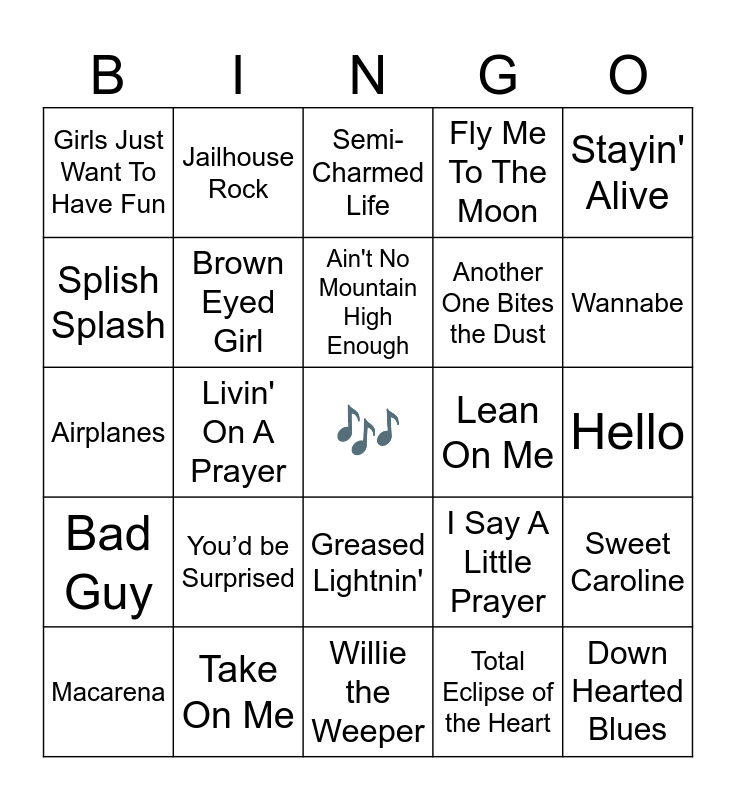 This bingo card has a free space and 51 words: Ain’t Misbehavin’, Down Hearted Blues, West End Blues, Willie the Weeper, You’d be Surprised, Come Fly With Me, Jailhouse Rock, Earth Angel, Splish Splash, Loving You, Brown Eyed Girl, Fly Me To The Moon, Sweet Caroline, I Say A Little Prayer, Born To Be Wild, I Want You Back, Ain't No Mountain High Enough, Lean On Me, Dancing Queen, Stayin' Alive, Livin' On A Prayer, Total Eclipse of the Heart, Girls Just Want To Have Fun, Another One Bites the Dust, Billie Jean, I Want It That Way, Wannabe, Waterfalls, Macarena, Semi-Charmed Life, Bye Bye Bye, Single Ladies, Hey Ya!, Umbrella, Lose Yourself, Take On Me, Radioactive, God's Plan, We Are Young, Firework, Hello, Bad Guy, Blank Space, Roar, Sugar, Payphone, Airplanes, Blinding Lights, Rockin' Robin, Greased Lightnin' and I wanna dance with somebody.