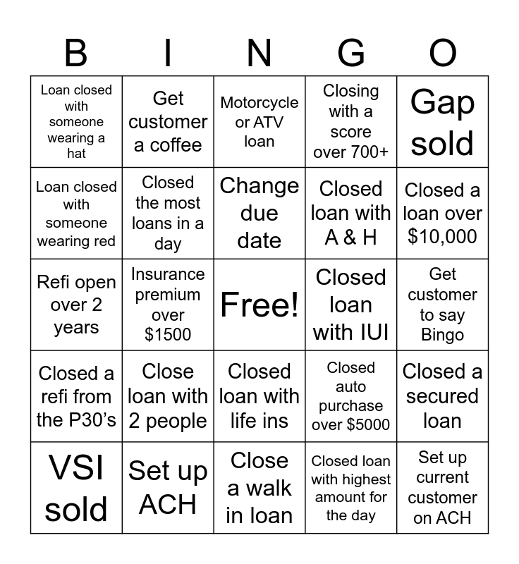 This bingo card has a free space and 24 words: Close loan with 2 people, Set up ACH, Change due date, VSI sold, Gap sold, Loan closed with someone wearing a hat, Loan closed with someone wearing red, Get customer a coffee, Closed loan with IUI, Closed loan with life ins, Closed loan with A & H, Refi open over 2 years, Closed auto purchase over $5000, Closed a secured loan, Closed the most loans in a day, Closed loan with highest amount for the day, Get customer to say Bingo, Motorcycle or ATV loan, Closed a loan over $10,000, Insurance premium over $1500, Set up current customer on ACH, Closed a refi from the P30’s, Closing with a score over 700+ and Close a walk in loan.