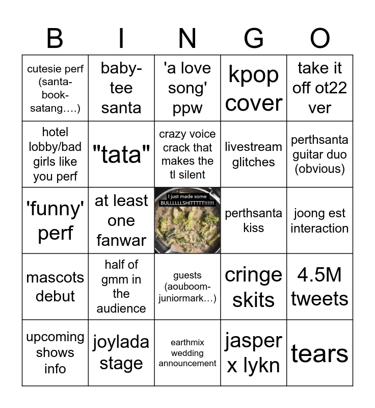 This bingo card has a free space and 24 words: half of gmm in the audience, joylada stage, crazy voice crack that makes the tl silent, upcoming shows info, take it off ot22 ver, cutesie perf (santa-book-satang….), hotel lobby/bad girls like you perf, baby-tee santa, perthsanta kiss, guests (aouboom-juniormark…), livestream glitches, 'funny' perf, cringe skits, 4.5M tweets, "tata", jasper x lykn, joong est interaction, 'a love song' ppw, perthsanta guitar duo (obvious), at least one fanwar, tears, mascots debut, kpop cover and earthmix wedding announcement.
