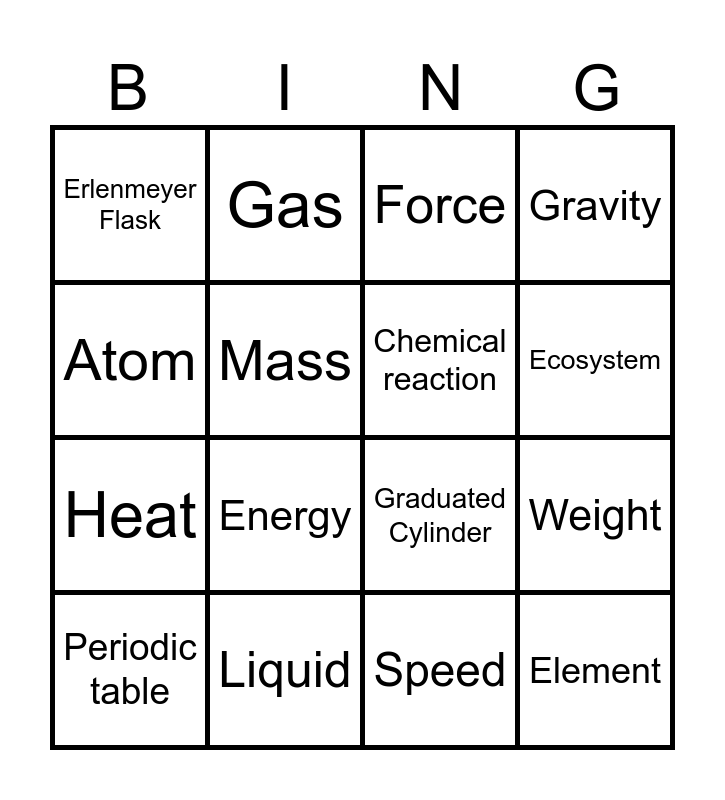 This bingo card has 16 words: Periodic table, Liquid, Force, Gravity, Atom, Gas, Graduated Cylinder, Weight, Erlenmeyer Flask, Mass, Speed, Ecosystem, Heat, Energy, Chemical reaction and Element.