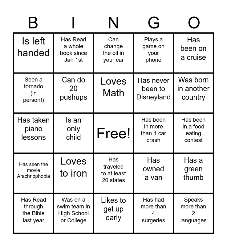 This bingo card has a free space and 24 words: Loves to iron, Was on a swim team in High School or College, Loves Math, Has Read through the Bible last year, Has been on a cruise, Is left handed, Seen a tornado (in person!), Has Read a whole book since Jan 1st, Has been in more than 1 car crash, Has traveled to at least 20 states, Has never been to Disneyland, Has taken piano lessons, Has owned a van, Has a green thumb, Can do 20 pushups, Has had more than 4 surgeries, Has been in a food eating contest, Can change the oil in your car, Was born in another country, Is an only child, Speaks more than 2 languages, Has seen the movie Arachnophobia, Plays a game on your phone and Likes to get up early.