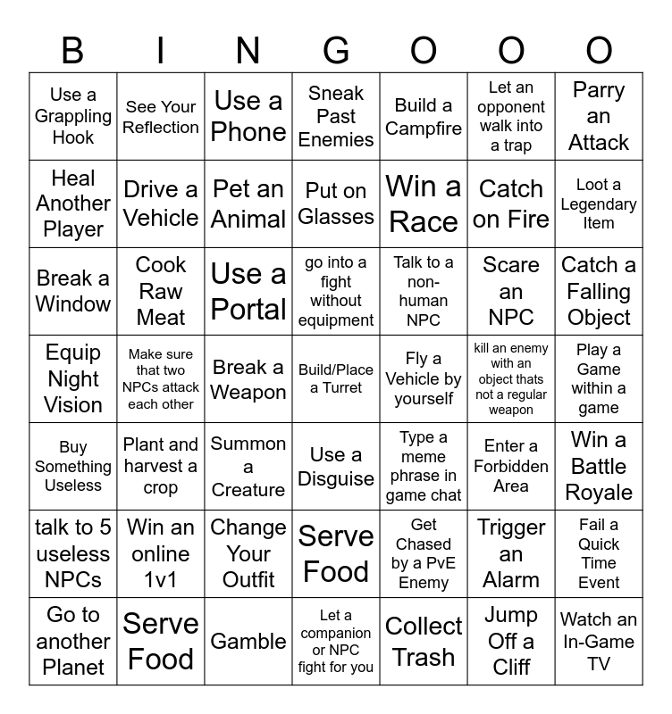 This bingo card has 61 words: Tame a Wild Animal, Equip Night Vision, Get Caught Stealing, Cook Raw Meat, Break a Weapon, Trigger an Alarm, Parry an Attack, Sleep in a Bed, Drive a Vehicle, Fail a Quick Time Event, Sneak Past Enemies, Change Your Outfit, Let an opponent walk into a trap, Summon a Creature, Jump Off a Cliff, Use a Grappling Hook, Catch on Fire, Build a Campfire, Enter a Secret Room, Heal Another Player, Loot a Legendary Item, Use a Phone, Catch a Falling Object, Scare an NPC, Ride a Zipline, Use a Disguise, Buy Something Useless, Get Poisoned, Pet an Animal, Enter a Forbidden Area, Play an Instrument, Win an online 1v1, Collect Trash, Watch an In-Game TV, See Your Reflection, Fly a Vehicle by yourself, Serve Food, Win a Race, Type a meme phrase in game chat, Put on Glasses, Get Chased by a PvE Enemy, Use a Portal, Break a Window, Enter a Code, Talk to a non-human NPC, Play a Game within a game, Go to another Planet, Gamble, Let a companion or NPC fight for you, go into a fight without equipment, Make sure that two NPCs attack each other, Befriend an enemy, talk to 5 useless NPCs, kill an enemy with an object thats not a regular weapon, watch a PvP battle without engaging, Plant and harvest a crop, Win a Battle Royale, Serve Food, Escape a fight by hiding in a bush or container, Build/Place a Turret and build a house.