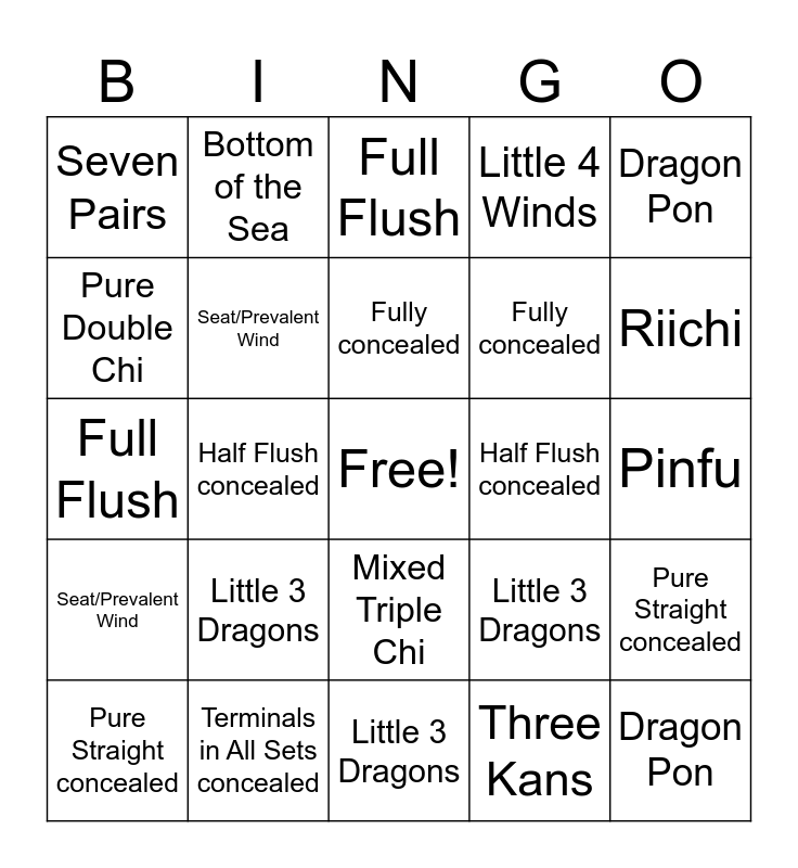 This bingo card has a free space and 290 words: Thirteen Orphans, Nine Gates, Little 4 Winds, Four Kans, Four Concealed Pons, Blessing of Heaven, Blessing of Earth, Big 4 Winds, Big 3 Dragons, All Terminals, All Honors, All Green, Full Flush concealed, Full Flush concealed, Full Flush concealed, Full Flush concealed, Full Flush concealed, Full Flush concealed, Full Flush, Full Flush, Full Flush, Full Flush, Full Flush, Full Flush, Blessing of Man, Blessing of Man, Blessing of Man, Blessing of Man, Blessing of Man, Blessing of Man, Twice Pure Double Chi, Twice Pure Double Chi, Twice Pure Double Chi, Twice Pure Double Chi, Twice Pure Double Chi, Twice Pure Double Chi, Twice Pure Double Chi, Twice Pure Double Chi, Terminals in All Sets concealed, Terminals in All Sets concealed, Terminals in All Sets concealed, Terminals in All Sets concealed, Terminals in All Sets concealed, Terminals in All Sets concealed, Terminals in All Sets concealed, Terminals in All Sets concealed, Terminals in All Sets concealed, Terminals in All Sets concealed, Half Flush concealed, Half Flush concealed, Half Flush concealed, Half Flush concealed, Half Flush concealed, Half Flush concealed, Half Flush concealed, Half Flush concealed, Half Flush concealed, Half Flush concealed, Triple Pon, Triple Pon, Triple Pon, Triple Pon, Triple Pon, Triple Pon, Three Kans, Three Kans, Three Kans, Three Kans, Three Kans, Three Kans, Three concealed Pons, Three concealed Pons, Three concealed Pons, Three concealed Pons, Three concealed Pons, Three concealed Pons, Three concealed Pons, Terminals in All Sets, Terminals in All Sets, Terminals in All Sets, Terminals in All Sets, Terminals in All Sets, Terminals in All Sets, Terminals in All Sets, Seven Pairs, Seven Pairs, Seven Pairs, Seven Pairs, Seven Pairs, Seven Pairs, Seven Pairs, Riichi Ippatsu, Riichi Ippatsu, Riichi Ippatsu, Riichi Ippatsu, Riichi Ippatsu, Riichi Ippatsu, Riichi Ippatsu, Riichi Daburu, Riichi Daburu, Riichi Daburu, Riichi Daburu, Pure Straight concealed, Pure Straight concealed, Pure Straight concealed, Pure Straight concealed, Pure Straight concealed, Pure Straight concealed, Pure Straight concealed, Outside Hand concealed, Outside Hand concealed, Outside Hand concealed, Outside Hand concealed, Outside Hand concealed, Outside Hand concealed, Outside Hand concealed, Mixed Triple Chi concealed, Mixed Triple Chi concealed, Mixed Triple Chi concealed, Mixed Triple Chi concealed, Mixed Triple Chi concealed, Mixed Triple Chi concealed, Mixed Triple Chi concealed, Little 3 Dragons, Little 3 Dragons, Little 3 Dragons, Little 3 Dragons, Little 3 Dragons, Little 3 Dragons, Little 3 Dragons, Half Flush, Half Flush, Half Flush, Half Flush, Half Flush, Half Flush, Half Flush, All Terminals/Honors, All Terminals/Honors, All Terminals/Honors, All Terminals/Honors, All Terminals/Honors, All Terminals/Honors, All Terminals/Honors, All Pon, All Pon, All Pon, All Pon, All Pon, All Pon, All Pon, Seat/Prevalent Wind, Seat/Prevalent Wind, Seat/Prevalent Wind, Seat/Prevalent Wind, Seat/Prevalent Wind, Seat/Prevalent Wind, Seat/Prevalent Wind, Seat/Prevalent Wind, Seat/Prevalent Wind, Seat/Prevalent Wind, Seat/Prevalent Wind, Robbing a Kan, Robbing a Kan, Robbing a Kan, Robbing a Kan, Robbing a Kan, Robbing a Kan, Robbing a Kan, Riichi, Riichi, Riichi, Riichi, Riichi, Riichi, Riichi, Riichi, Riichi, Riichi, Riichi, Pure Straight, Pure Straight, Pure Straight, Pure Straight, Pure Straight, Pure Straight, Pure Straight, Pure Straight, Pure Straight, Pure Straight, Pure Straight, Pure Double Chi, Pure Double Chi, Pure Double Chi, Pure Double Chi, Pure Double Chi, Pure Double Chi, Pure Double Chi, Pure Double Chi, Pure Double Chi, Pure Double Chi, Pure Double Chi, Pinfu, Pinfu, Pinfu, Pinfu, Pinfu, Pinfu, Pinfu, Pinfu, Pinfu, Pinfu, Pinfu, Outside Hand, Outside Hand, Outside Hand, Outside Hand, Outside Hand, Outside Hand, Outside Hand, Outside Hand, Outside Hand, Outside Hand, Outside Hand, Mixed Triple Chi, Mixed Triple Chi, Mixed Triple Chi, Mixed Triple Chi, Mixed Triple Chi, Mixed Triple Chi, Mixed Triple Chi, Mixed Triple Chi, Mixed Triple Chi, Mixed Triple Chi, Mixed Triple Chi, Fully concealed, Fully concealed, Fully concealed, Fully concealed, Fully concealed, Fully concealed, Fully concealed, Fully concealed, Fully concealed, Fully concealed, Fully concealed, Dragon Pon, Dragon Pon, Dragon Pon, Dragon Pon, Dragon Pon, Dragon Pon, Dragon Pon, Dragon Pon, Dragon Pon, Dragon Pon, Dragon Pon, Bottom of the Sea, Bottom of the Sea, Bottom of the Sea, Bottom of the Sea, Bottom of the Sea, Bottom of the Sea, Bottom of the Sea, Bottom of the Sea, Bottom of the Sea, Bottom of the Sea, Bottom of the Sea, All Simples, All Simples, All Simples, All Simples, All Simples, All Simples, All Simples, All Simples, All Simples, All Simples, All Simples, After a Kan, After a Kan, After a Kan, After a Kan, After a Kan, After a Kan, After a Kan, After a Kan, After a Kan, After a Kan and After a Kan.