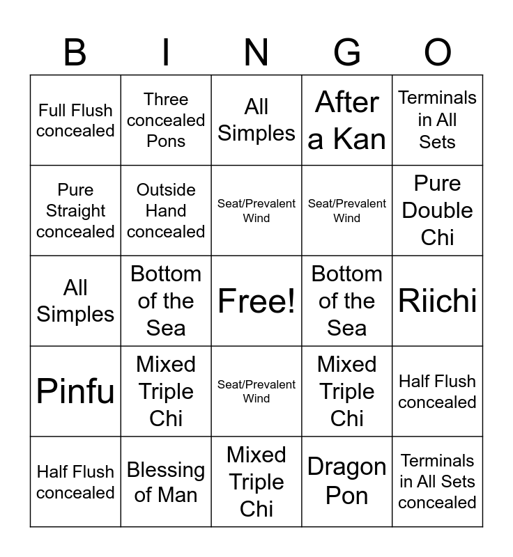 This bingo card has a free space and 290 words: After a Kan, After a Kan, After a Kan, After a Kan, After a Kan, After a Kan, After a Kan, After a Kan, After a Kan, After a Kan, After a Kan, All Green, All Honors, All Pon, All Pon, All Pon, All Pon, All Pon, All Pon, All Pon, All Simples, All Simples, All Simples, All Simples, All Simples, All Simples, All Simples, All Simples, All Simples, All Simples, All Simples, All Terminals, All Terminals/Honors, All Terminals/Honors, All Terminals/Honors, All Terminals/Honors, All Terminals/Honors, All Terminals/Honors, All Terminals/Honors, Big 3 Dragons, Big 4 Winds, Blessing of Earth, Blessing of Heaven, Blessing of Man, Blessing of Man, Blessing of Man, Blessing of Man, Blessing of Man, Blessing of Man, Bottom of the Sea, Bottom of the Sea, Bottom of the Sea, Bottom of the Sea, Bottom of the Sea, Bottom of the Sea, Bottom of the Sea, Bottom of the Sea, Bottom of the Sea, Bottom of the Sea, Bottom of the Sea, Dragon Pon, Dragon Pon, Dragon Pon, Dragon Pon, Dragon Pon, Dragon Pon, Dragon Pon, Dragon Pon, Dragon Pon, Dragon Pon, Dragon Pon, Four Concealed Pons, Four Kans, Full Flush, Full Flush, Full Flush, Full Flush, Full Flush, Full Flush, Full Flush concealed, Full Flush concealed, Full Flush concealed, Full Flush concealed, Full Flush concealed, Full Flush concealed, Fully concealed, Fully concealed, Fully concealed, Fully concealed, Fully concealed, Fully concealed, Fully concealed, Fully concealed, Fully concealed, Fully concealed, Fully concealed, Half Flush, Half Flush, Half Flush, Half Flush, Half Flush, Half Flush, Half Flush, Half Flush concealed, Half Flush concealed, Half Flush concealed, Half Flush concealed, Half Flush concealed, Half Flush concealed, Half Flush concealed, Half Flush concealed, Half Flush concealed, Half Flush concealed, Little 3 Dragons, Little 3 Dragons, Little 3 Dragons, Little 3 Dragons, Little 3 Dragons, Little 3 Dragons, Little 3 Dragons, Little 4 Winds, Mixed Triple Chi, Mixed Triple Chi, Mixed Triple Chi, Mixed Triple Chi, Mixed Triple Chi, Mixed Triple Chi, Mixed Triple Chi, Mixed Triple Chi, Mixed Triple Chi, Mixed Triple Chi, Mixed Triple Chi, Mixed Triple Chi concealed, Mixed Triple Chi concealed, Mixed Triple Chi concealed, Mixed Triple Chi concealed, Mixed Triple Chi concealed, Mixed Triple Chi concealed, Mixed Triple Chi concealed, Nine Gates, Outside Hand, Outside Hand, Outside Hand, Outside Hand, Outside Hand, Outside Hand, Outside Hand, Outside Hand, Outside Hand, Outside Hand, Outside Hand, Outside Hand concealed, Outside Hand concealed, Outside Hand concealed, Outside Hand concealed, Outside Hand concealed, Outside Hand concealed, Outside Hand concealed, Pinfu, Pinfu, Pinfu, Pinfu, Pinfu, Pinfu, Pinfu, Pinfu, Pinfu, Pinfu, Pinfu, Pure Double Chi, Pure Double Chi, Pure Double Chi, Pure Double Chi, Pure Double Chi, Pure Double Chi, Pure Double Chi, Pure Double Chi, Pure Double Chi, Pure Double Chi, Pure Double Chi, Pure Straight, Pure Straight, Pure Straight, Pure Straight, Pure Straight, Pure Straight, Pure Straight, Pure Straight, Pure Straight, Pure Straight, Pure Straight, Pure Straight concealed, Pure Straight concealed, Pure Straight concealed, Pure Straight concealed, Pure Straight concealed, Pure Straight concealed, Pure Straight concealed, Riichi, Riichi, Riichi, Riichi, Riichi, Riichi, Riichi, Riichi, Riichi, Riichi, Riichi, Riichi Daburu, Riichi Daburu, Riichi Daburu, Riichi Daburu, Riichi Ippatsu, Riichi Ippatsu, Riichi Ippatsu, Riichi Ippatsu, Riichi Ippatsu, Riichi Ippatsu, Riichi Ippatsu, Robbing a Kan, Robbing a Kan, Robbing a Kan, Robbing a Kan, Robbing a Kan, Robbing a Kan, Robbing a Kan, Seat/Prevalent Wind, Seat/Prevalent Wind, Seat/Prevalent Wind, Seat/Prevalent Wind, Seat/Prevalent Wind, Seat/Prevalent Wind, Seat/Prevalent Wind, Seat/Prevalent Wind, Seat/Prevalent Wind, Seat/Prevalent Wind, Seat/Prevalent Wind, Seven Pairs, Seven Pairs, Seven Pairs, Seven Pairs, Seven Pairs, Seven Pairs, Seven Pairs, Terminals in All Sets, Terminals in All Sets, Terminals in All Sets, Terminals in All Sets, Terminals in All Sets, Terminals in All Sets, Terminals in All Sets, Terminals in All Sets concealed, Terminals in All Sets concealed, Terminals in All Sets concealed, Terminals in All Sets concealed, Terminals in All Sets concealed, Terminals in All Sets concealed, Terminals in All Sets concealed, Terminals in All Sets concealed, Terminals in All Sets concealed, Terminals in All Sets concealed, Thirteen Orphans, Three concealed Pons, Three concealed Pons, Three concealed Pons, Three concealed Pons, Three concealed Pons, Three concealed Pons, Three concealed Pons, Three Kans, Three Kans, Three Kans, Three Kans, Three Kans, Three Kans, Triple Pon, Triple Pon, Triple Pon, Triple Pon, Triple Pon, Triple Pon, Twice Pure Double Chi, Twice Pure Double Chi, Twice Pure Double Chi, Twice Pure Double Chi, Twice Pure Double Chi, Twice Pure Double Chi, Twice Pure Double Chi and Twice Pure Double Chi.