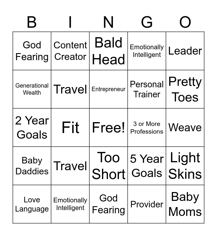 This bingo card has a free space and 24 words: Travel, Emotionally Intelligent, Entrepreneur, Love Language, Leader, God Fearing, Generational Wealth, Content Creator, 3 or More Professions, Too Short, Personal Trainer, 2 Year Goals, 5 Year Goals, Light Skins, Travel, Provider, Weave, Bald Head, Pretty Toes, Fit, Baby Moms, Baby Daddies, Emotionally Intelligent and God Fearing.
