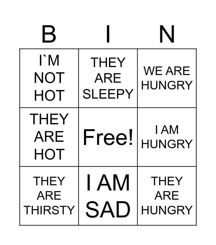 This bingo card has a free space and 77 words: I AM HAPPY, SHE IS SAD, WE ARE HUNGRY, SHE IS HUNGRY, YOU ARE BORED, THEY ARE THIRSTY, HE IS COLD, HE IS HOT, I AM THIRSTY, WE ARE HOT, WE ARE SAD, WE ARE COLD, I AM SAD, I AM HUNGRY, I AM SLEEPY, I AM TIRED, THEY ARE HAPPY, THEY ARE SAD, THEY ARE TIRED, THEY ARE HUNGRY, THEY ARE COLD, THEY ARE BORED, THEY ARE THIRSTY, THEY ARE SLEEPY, THEY ARE HOT, IT IS COLD, IT IS HOT, IT IS THIRSTY, IT IS HUNGRY, I AM HOT, I AM COLD, I AM BORED, SHE IS HOT, SHE IS COLD, SHE IS BORED, SHE IS TIRED, SHE IS SLEEPY, YOU ARE HAPPY, YOU ARE HOT, YOU ARE COLD, YOU ARE ANGRY, YOU ARE HAPPY, YOU ARE HUNGRY, YOU ARE THIRSTY, I`M NOT HAPPY, I`M NOT SAD, I`M NOT COLD, I`M NOT HOT, I`M NOT THIRSTY, WE AREN`T HAPPY, WE AREN`T COLD, WE AREN`T SAD, WE AREN`T SLEEPY, WE AREN`T BORED, THEY AREN`T HUNGRY, THEY AREN`T TIRED, THEY AREN`T COLD, THEY AREN`T SAD, THEY AREN`T TIRED, YOU AREN`T HAPPY, YOU AREN`T SAD, YOU AREN`T THIRSTY, YOU AREN`T TIRED, YOU AREN`T ANGRY, SHE ISN`T SAD, SHE ISN`T COLD, SHE ISN`T HUNGRY, SHE ISN`T HOT, HE ISN`T TIRED, HE ISN`T BORED, HE ISN`T SAD, HE ISN`T SLEEPY, HE ISN`T HAPPY, IT ISN`T COLD, IT ISN`T SUNNY, IT ISN`T HUNGRY and IT ISN`T THIRSTY.