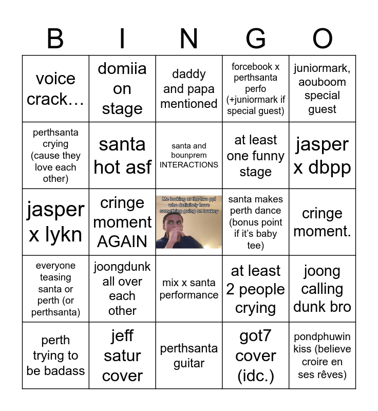 This bingo card has a free space and 24 words: perth trying to be badass, joongdunk all over each other, santa and bounprem INTERACTIONS, got7 cover (idc.), juniormark, aouboom special guest, voice crack…, domiia on stage, daddy and papa mentioned, santa makes perth dance (bonus point if it’s baby tee), cringe moment., jasper x lykn, santa hot asf, at least 2 people crying, joong calling dunk bro, perthsanta crying (cause they love each other), jeff satur cover, perthsanta guitar, forcebook x perthsanta perfo (+juniormark if special guest), jasper x dbpp, everyone teasing santa or perth (or perthsanta), cringe moment AGAIN, mix x santa performance, at least one funny stage and pondphuwin kiss (believe croire en ses rêves).