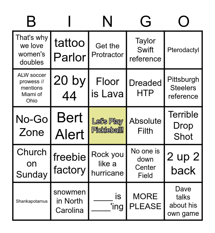 This bingo card has a free space and 24 words: freebie factory, snowmen in North Carolina, Floor is Lava, Shankapotamus, Pterodactyl, That's why we love women's doubles, ALW soccer prowess // mentions Miami of Ohio, tattoo Parlor, Absolute Filth, Rock you like a hurricane, Dreaded HTP, No-Go Zone, No one is down Center Field, 2 up 2 back, 20 by 44, MORE PLEASE, Terrible Drop Shot, Get the Protractor, Pittsburgh Steelers reference, Bert Alert, Dave talks about his own game, Church on Sunday, Taylor Swift reference and ____ is ____'ing.