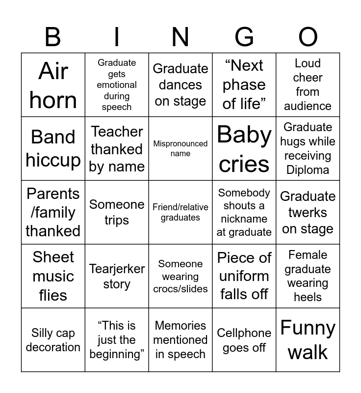 This bingo card has a free space and 24 words: Tearjerker story, “This is just the beginning”, Mispronounced name, Silly cap decoration, Loud cheer from audience, Air horn, Band hiccup, Graduate gets emotional during speech, Somebody shouts a nickname at graduate, Someone wearing crocs/slides, Baby cries, Parents /family thanked, Piece of uniform falls off, Female graduate wearing heels, Teacher thanked by name, Cellphone goes off, Graduate twerks on stage, Graduate dances on stage, Graduate hugs while receiving Diploma, Someone trips, Funny walk, Sheet music flies, “Next phase of life” and Memories mentioned in speech.