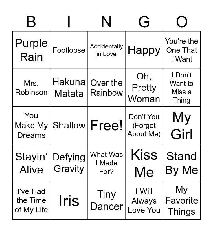 This bingo card has a free space and 25 words: Defying Gravity, Tiny Dancer, Over the Rainbow, I’ve Had the Time of My Life, You’re the One That I Want, Purple Rain, Mrs. Robinson, Footloose, Don’t You (Forget About Me), What Was I Made For?, Oh, Pretty Woman, You Make My Dreams, Kiss Me, Stand By Me, Hakuna Matata, 9 to 5, My Girl, Accidentally in Love, I Don’t Want to Miss a Thing, Shallow, My Favorite Things, Iris, Stayin’ Alive, Happy and I Will Always Love You.