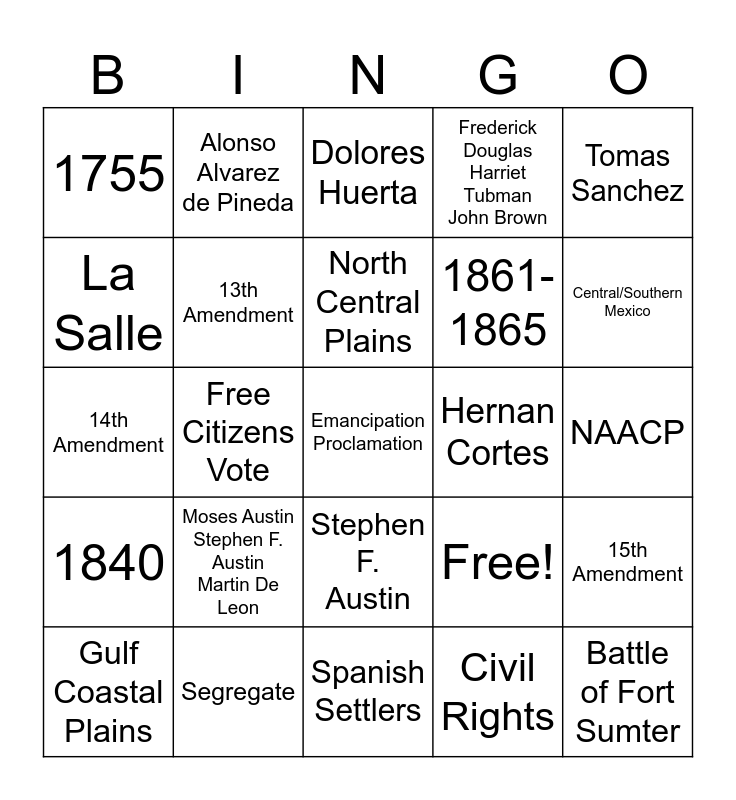 This bingo card has 25 words: Moses Austin Stephen F. Austin Martin De Leon, Spanish Settlers, North Central Plains, Gulf Coastal Plains, Tomas Sanchez, 1755, La Salle, Alonso Alvarez de Pineda, Hernan Cortes, Stephen F. Austin, 1861-1865, 14th Amendment, Free!, 15th Amendment, 13th Amendment, Battle of Fort Sumter, NAACP, Dolores Huerta, Central/Southern Mexico, Free Citizens Vote, Emancipation Proclamation, Segregate, 1840, Frederick Douglas Harriet Tubman John Brown and Civil Rights.