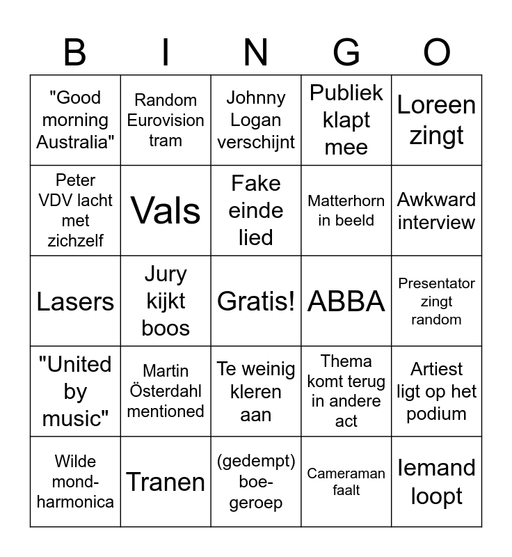 This bingo card has a free space and 24 words: Martin Österdahl mentioned, Tranen, Fake einde lied, Wilde mond-harmonica, Loreen zingt, "Good morning Australia", Peter VDV lacht met zichzelf, Random Eurovision tram, ABBA, Te weinig kleren aan, Matterhorn in beeld, Lasers, Thema komt terug in andere act, Artiest ligt op het podium, Vals, Cameraman faalt, Presentator zingt random, Johnny Logan verschijnt, Awkward interview, Jury kijkt boos, Iemand loopt, "United by music", Publiek klapt mee and (gedempt) boe-geroep.