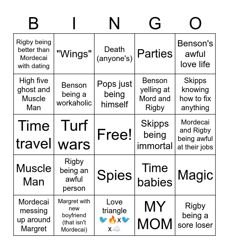 This bingo card has a free space and 24 words: Mordecai messing up around Margret, Rigby being an awful person, Pops just being himself, MY MOM, Benson's awful love life, Rigby being better than Mordecai with dating, "Wings", Death (anyone's), Skipps being immortal, Mordecai and Rigby being awful at their jobs, Time travel, Benson being a workaholic, Time babies, Magic, High five ghost and Muscle Man, Margret with new boyfriend (that isn't Mordecai), Love triangle 🐦🔥x🐦x☁️, Parties, Skipps knowing how to fix anything, Muscle Man, Turf wars, Spies, Benson yelling at Mord and Rigby and Rigby being a sore loser.