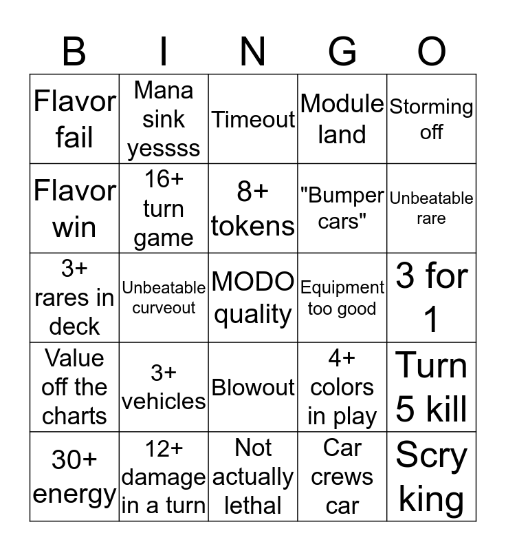 This bingo card has a free space and 24 words: 3+ vehicles, 12+ damage in a turn, 8+ tokens, 30+ energy, Storming off, Flavor fail, Flavor win, Mana sink yessss, Equipment too good, Blowout, "Bumper cars", 3+ rares in deck, 4+ colors in play, Turn 5 kill, 16+ turn game, Car crews car, 3 for 1, Timeout, Unbeatable rare, Unbeatable curveout, Scry king, Value off the charts, Module land and Not actually lethal.