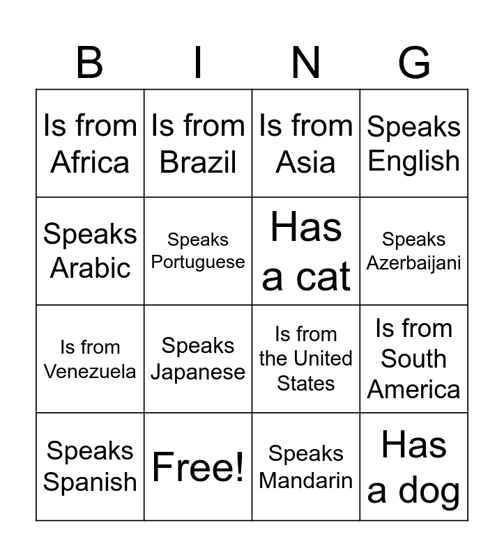 This bingo card has 16 words: Free!, Is from South America, Is from Asia, Is from Africa, Is from Venezuela, Is from Brazil, Is from the United States, Speaks Mandarin, Speaks Arabic, Speaks Portuguese, Speaks Spanish, Speaks English, Speaks Japanese, Speaks Azerbaijani, Has a cat and Has a dog.