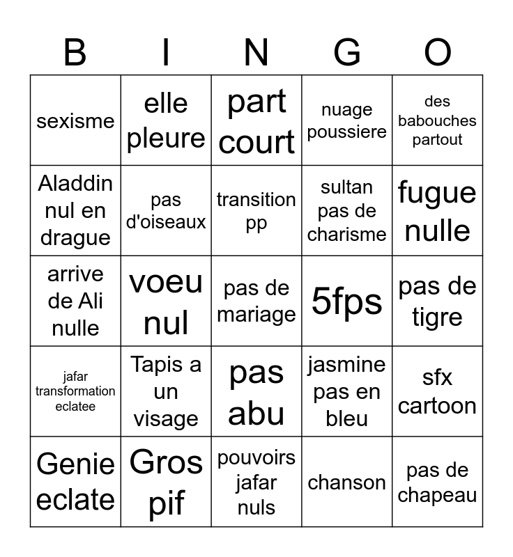 This bingo card has a free space and 24 words: Tapis a un visage, Gros pif, transition pp, Genie eclate, des babouches partout, sexisme, Aladdin nul en drague, elle pleure, 5fps, pas abu, sultan pas de charisme, arrive de Ali nulle, jasmine pas en bleu, sfx cartoon, pas d'oiseaux, chanson, pas de tigre, part court, fugue nulle, voeu nul, pas de chapeau, jafar transformation eclatee, nuage poussiere and pouvoirs jafar nuls.