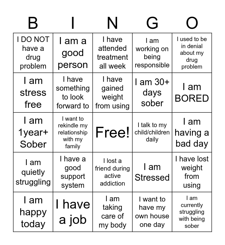 This bingo card has a free space and 29 words: I am happy today, I had to restart my recovery journey multiple times, I want to rekindle my relationship with my family, I cant wait until I'm off parole, I DO NOT have a drug problem, I have attended treatment all week, I have something to look forward to, I have a good support system, I talk to my child/children daily, I have a job, I am having a bad day, I am currently struggling with being sober, I am taking care of my body, I want to have my own house one day, I am BORED, I feel like I should stay quiet when I am angry, I lost a friend during active addiction, I am quietly struggling, I used to be in denial about my drug problem, I am 1year+ Sober, I am Stressed, I am TRYING to be better, I am 30+ days sober, I am stress free, I am working on being responsible, I am a good person, I have lost weight from using, I have gained weight from using and I think twice before I make decisions.