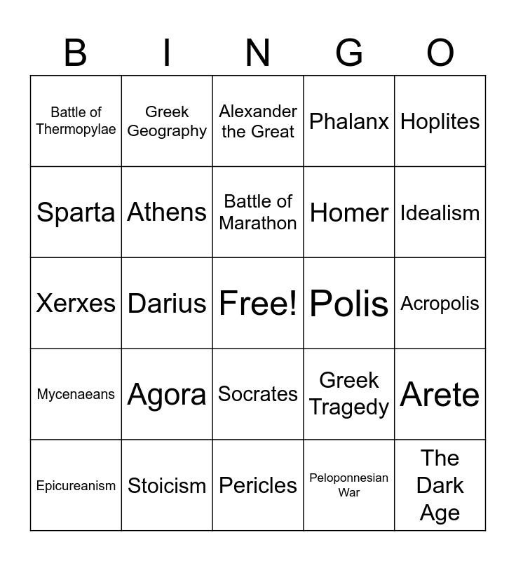 This bingo card has a free space and 24 words: Agora, Stoicism, Battle of Marathon, Epicureanism, Hoplites, Battle of Thermopylae, Sparta, Greek Geography, Polis, Socrates, Homer, Xerxes, Greek Tragedy, Arete, Athens, Peloponnesian War, Acropolis, Alexander the Great, Idealism, Darius, The Dark Age, Mycenaeans, Phalanx and Pericles.