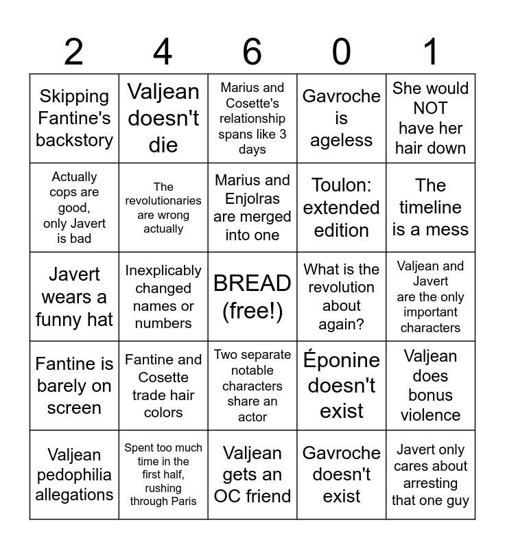 This bingo card has a free space and 27 words: Éponine doesn't exist, Marius is cooler than he should be, Toulon: extended edition, Valjean gets an OC friend, Actually cops are good, only Javert is bad, Marius and Cosette's relationship spans like 3 days, Valjean doesn't die, Fantine is barely on screen, What is the revolution about again?, Valjean does bonus violence, Javert wears a funny hat, Gavroche is ageless, Valjean pedophilia allegations, Spent too much time in the first half, rushing through Paris, The timeline is a mess, Javert gets an OC buddy cop, The revolutionaries are wrong actually, Marius and Enjolras are merged into one, Fantine and Cosette trade hair colors, Skipping Fantine's backstory, Valjean and Javert are the only important characters, Gavroche doesn't exist, Inexplicably changed names or numbers, Javert only cares about arresting that one guy, Two separate notable characters share an actor, She would NOT have her hair down and Javert's suicide is somehow ridiculous.