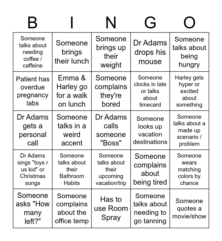 This bingo card has a free space and 24 words: Someone talks about their Bathroom Habits, Someone complains about the office temp, Someone complains they're bored, Someone asks "How many left?", Someone talks about being hungry, Someone talks about needing coffee / caffeine, Patient has overdue pregnancy labs, Someone brings their lunch, Someone looks up vacation destinations, Someone talks about their upcoming vacation/trip, Someone clocks in late or talks about timecard, Dr Adams gets a personal call, Someone complains about being tired, Someone wears matching colors by chance, Emma & Harley go for a walk on lunch, Someone talks about needing to go tanning, Someone talks about a made up scenario / problem, Someone brings up their weight, Harley gets hyper or excited about something, Someone talks in a weird accent, Someone quotes a movie/show, Dr Adams sings "toys r us kid" or Christmas songs, Dr Adams drops his mouse and Has to use Room Spray.