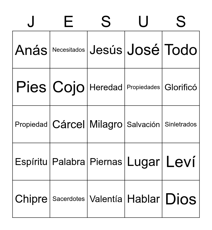 This bingo card has 30 words: Sacerdotes, Saduceos, Cárcel, Cinco, Anás, Jesús, Cojo, Piernas, Salvación, Valentía, Sinletrados, Milagro, Hablar, Dios, Glorificó, Oraron, Lugar, Espíritu, Palabra, Todo, Propiedad, Testimonio, Necesitados, Propiedades, Pies, José, Leví, Chipre, Heredad and Pies.