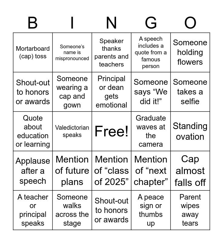 This bingo card has a free space and 29 words: A teacher or principal speaks, “Pomp and Circumstance” plays, Valedictorian speaks, Someone dances, Mortarboard (cap) toss, Speaker thanks parents and teachers, Someone wearing a cap and gown, Mention of future plans, Graduate waves at the camera, Someone walks across the stage, Standing ovation, Parent wipes away tears, Shout-out to honors or awards, A peace sign or thumbs up, Someone takes a selfie, Balloons in the background, Mention of “class of 2025”, Applause after a speech, Someone holding flowers, Quote about education or learning, Mention of “next chapter”, Family member cheering loudly, Someone says “We did it!”, Shout-out to honors or awards, A speech includes a quote from a famous person, Someone’s name is mispronounced, Cap almost falls off, Principal or dean gets emotional and Someone trips walking across the stage (but is fine!).