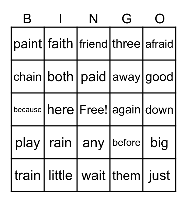 This bingo card has a free space and 25 words: rain, wait, paid, train, afraid, paint, chain, faith, again, any, away, because, before, big, both, but, down, friend, good, here, just, little, play, three and them.