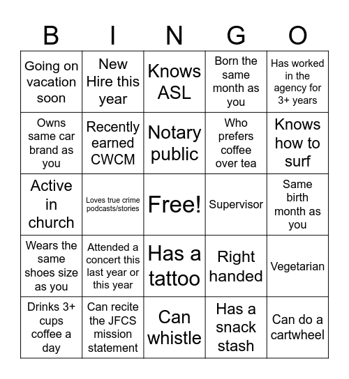 This bingo card has a free space and 24 words: Attended a concert this last year or this year, Can recite the JFCS mission statement, Notary public, Drinks 3+ cups coffee a day, Has worked in the agency for 3+ years, Going on vacation soon, Owns same car brand as you, New Hire this year, Supervisor, Has a tattoo, Who prefers coffee over tea, Active in church, Right handed, Vegetarian, Recently earned CWCM, Has a snack stash, Same birth month as you, Knows ASL, Knows how to surf, Loves true crime podcasts/stories, Can do a cartwheel, Wears the same shoes size as you, Born the same month as you and Can whistle.