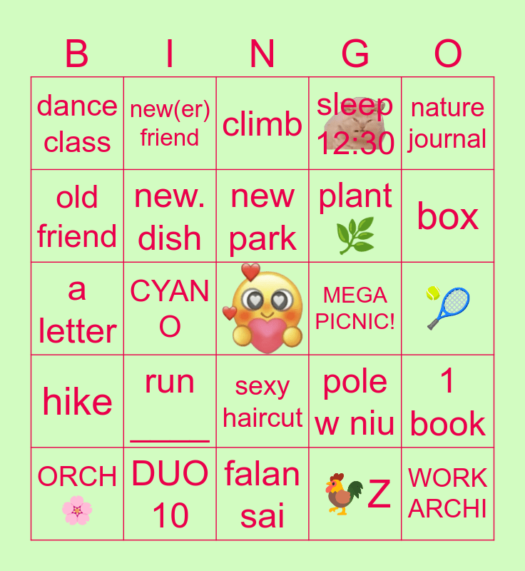 This bingo card has 1 images, a free space and 24 words: run ____, DUO 10, new park, ORCH 🌸, nature journal, dance class, old friend, new(er) friend, MEGA PICNIC!, sexy haircut, plant 🌿, a letter, pole w niu, 1 book, new. dish, 🐓Z, 🎾, climb, box, CYAN O, WORK ARCHI, hike, sleep 12:30 and falan sai.