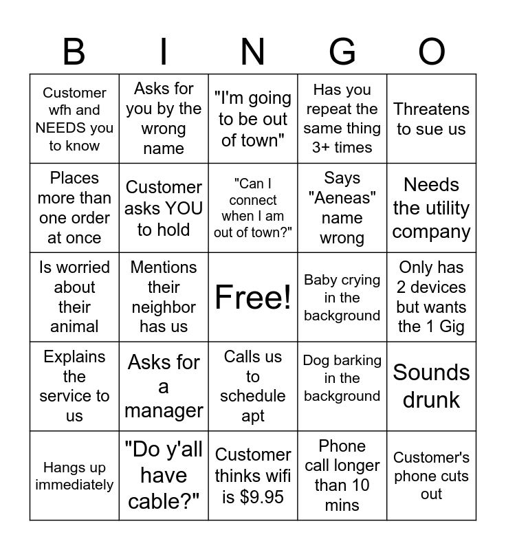 This bingo card has a free space and 29 words: Hangs up immediately, Customer curses, Mentions their neighbor has us, Bribe for shorter wait time, Customer wfh and NEEDS you to know, "I'm going to be out of town", Customer asks YOU to hold, Asks for a manager, Baby crying in the background, "Do y'all have cable?", Only has 2 devices but wants the 1 Gig, Customer's phone cuts out, Customer thinks wifi is $9.95, Phone call longer than 10 mins, Needs the utility company, "Is this cell phone", Calls us to schedule apt, Explains the service to us, Threatens to sue us, Is worried about their animal, Dog barking in the background, Asks for Sonia, Says "Aeneas" name wrong, Places more than one order at once, Has you repeat the same thing 3+ times, Asks for you by the wrong name, Sounds drunk, "Can I connect when I am out of town?" and Customer asks for billing or tech support.