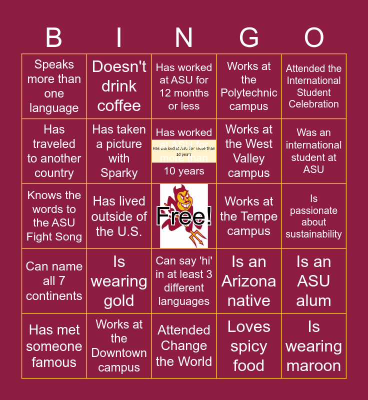 This bingo card has 1 images, a free space and 24 words: Is wearing gold, Works at the Downtown campus, Has worked at ASU for more than 10 years, Has met someone famous, Attended the International Student Celebration, Speaks more than one language, Has traveled to another country, Doesn't drink coffee, Works at the Tempe campus, Can say 'hi' in at least 3 different languages, Works at the West Valley campus, Knows the words to the ASU Fight Song, Is an Arizona native, Is an ASU alum, Has taken a picture with Sparky, Loves spicy food, Is passionate about sustainability, Has worked at ASU for 12 months or less, Was an international student at ASU, Has lived outside of the U.S., Is wearing maroon, Can name all 7 continents, Works at the Polytechnic campus and Attended Change the World.