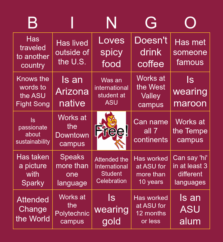 This bingo card has a free space and 24 words: Speaks more than one language, Works at the Polytechnic campus, Was an international student at ASU, Attended Change the World, Has met someone famous, Has traveled to another country, Knows the words to the ASU Fight Song, Has lived outside of the U.S., Can name all 7 continents, Attended the International Student Celebration, Works at the West Valley campus, Is passionate about sustainability, Has worked at ASU for more than 10 years, Can say 'hi' in at least 3 different languages, Is an Arizona native, Has worked at ASU for 12 months or less, Works at the Tempe campus, Loves spicy food, Is wearing maroon, Works at the Downtown campus, Is an ASU alum, Has taken a picture with Sparky, Doesn't drink coffee and Is wearing gold.