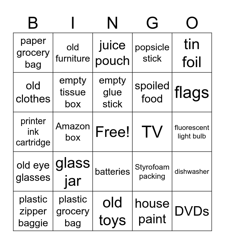 This bingo card has a free space and 24 words: glass jar, plastic grocery bag, empty glue stick, plastic zipper baggie, tin foil, paper grocery bag, old clothes, old furniture, TV, batteries, spoiled food, printer ink cartridge, Styrofoam packing, dishwasher, empty tissue box, house paint, fluorescent light bulb, juice pouch, flags, Amazon box, DVDs, old eye glasses, popsicle stick and old toys.