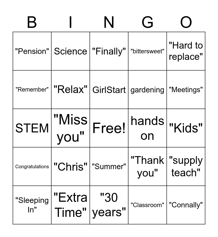 This bingo card has a free space and 29 words: "Sleeping In", "Family", "Miss you", "Vacation", "Pension", "Finally", "Relax", "Chris", hands on, "Extra Time", "Kids", "Connally", "30 years", "Classroom", "Meetings", photography, "Summer", Congratulations, "Hard to replace", STEM, "Thank you", "Keep in Touch", gardening, "Remember", "bittersweet", Science, "supply teach", GirlStart and Kuykendall.